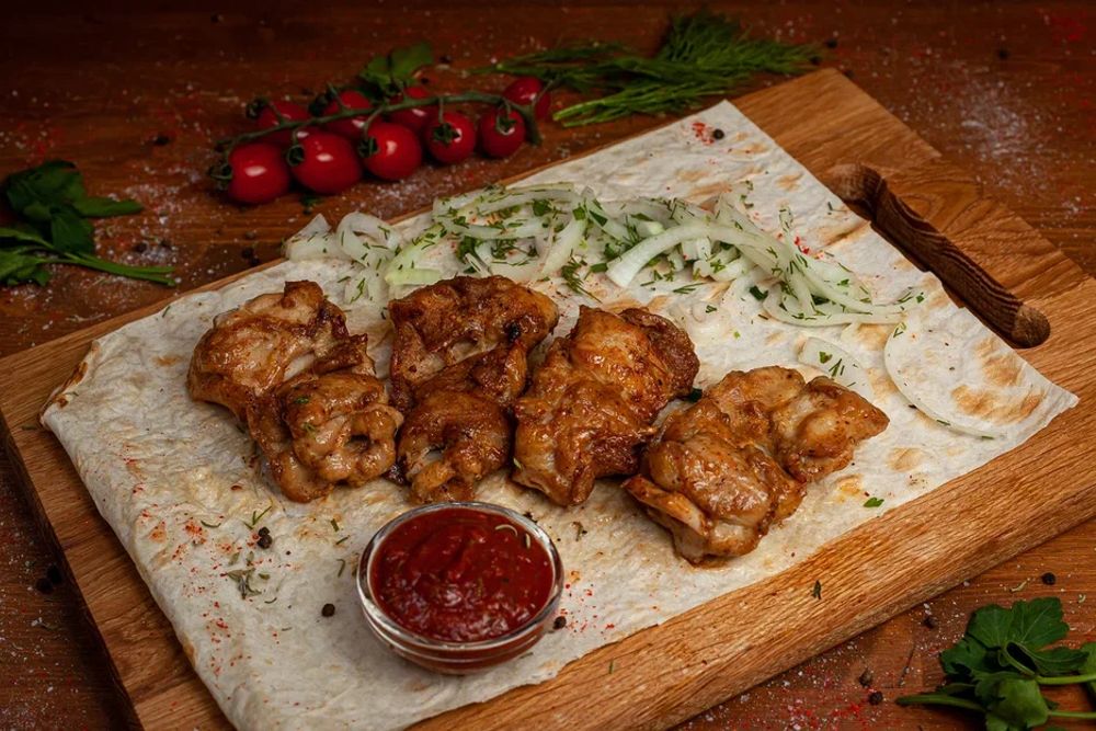 100 г./150 ₽, Подается с лавашом, луком и зеленью
